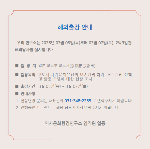 우리 연구소는 2026년 3월 5일(목)부터 3월 7일(토), 2박 3일간 아래와 같이 해외출장을 실시합니다. 진행 중인 프로젝트 관련 문의는 해당 임원 또는 담당자에게 직접 연락 주시기 바라며, 현상변경 문의는 대표전화 031-348-2255로 연락 부탁드립니다.